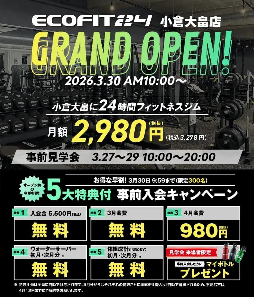 24時間フィットネスジム「エコフィット24」を展開するエーイーシー株式会社(本社:愛知県名古屋市、代表取締役:中村康宏)は、2026年3月30日(月)、福岡県北九州市小倉北区大畠に、全国48店舗目となる「エコフィット24 小倉大畠店」をオープンいたします。