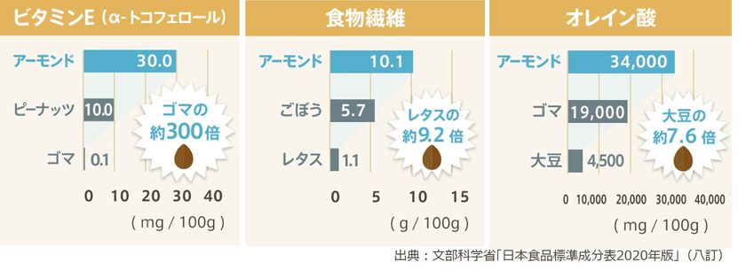 アーモンドの栄養価の特長(主要成分比較)