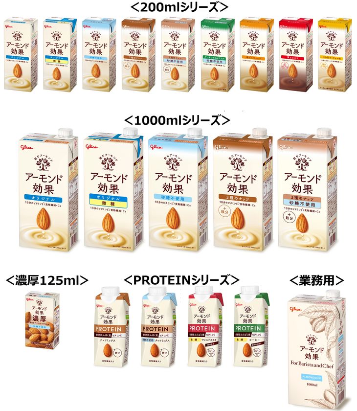 さらに、濃厚でもなめらかでアーモンドの自然な甘さと香ばしい味わいが楽しめる「アーモンド効果<濃厚 砂糖不使用>」や、素材のおいしさで健康的でしなやかな身体づくりをサポートする「アーモンド効果 PROTEIN」シリーズ、飲食店をはじめとしたプロ・業務用に開発した、「アーモンド効果<For Barista and Chef>」も展開し、幅広いお客様にあらゆるシーンでお楽しみいただけます。