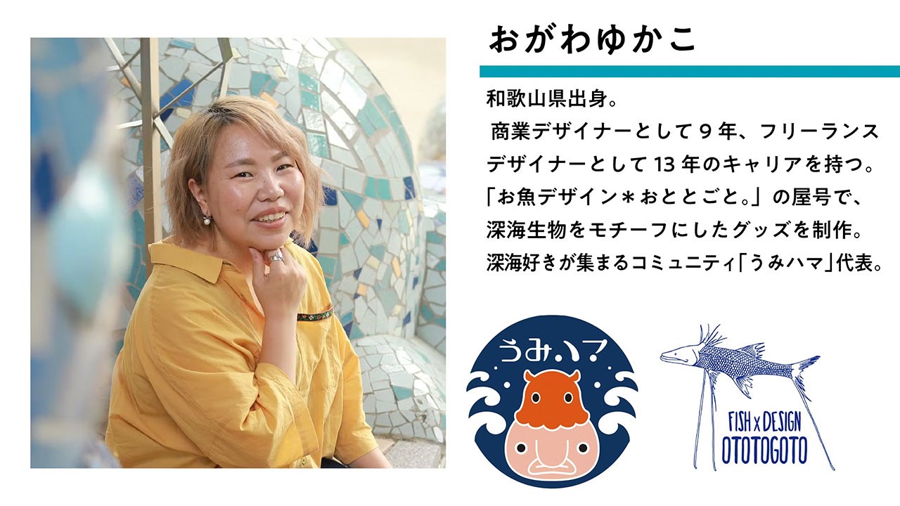 海好き、深海好きのコミュニティ「うみハマ〜深い海にハマる〜」を主宰し、プロのデザイナーとして20年以上のキャリアを持つ、「お魚デザイン*おととごと。」のおがわゆかこさん。ご自身でもオリジナルキャラクターを描き、グッズを制作しているおがわさん×フカメディアのコラボグッズにご期待ください。
