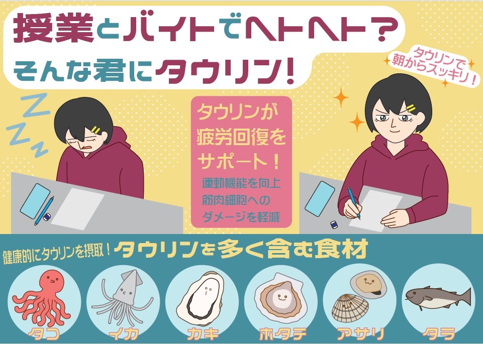 今回紹介した3点はいずれも既存素材を用いず、学生や教員がすべて自ら作成した作品です。発想力や表現力の豊かさに加え、イラストスキルの高さにも大いに感銘を受けました。ここでは紹介しきれませんでしたが、「猫×タウリン」「ダイエット・筋トレ×タウリン」など、ユニークなテーマの作品もありました。