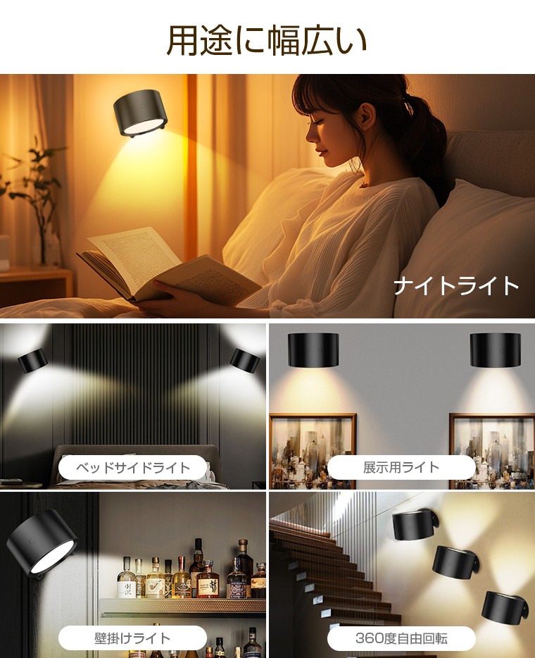 マグネット接続によりライト部分は360°回転可能。スポットライト・間接照明・読書灯として、欲しい場所だけを自由に照らすことができます。