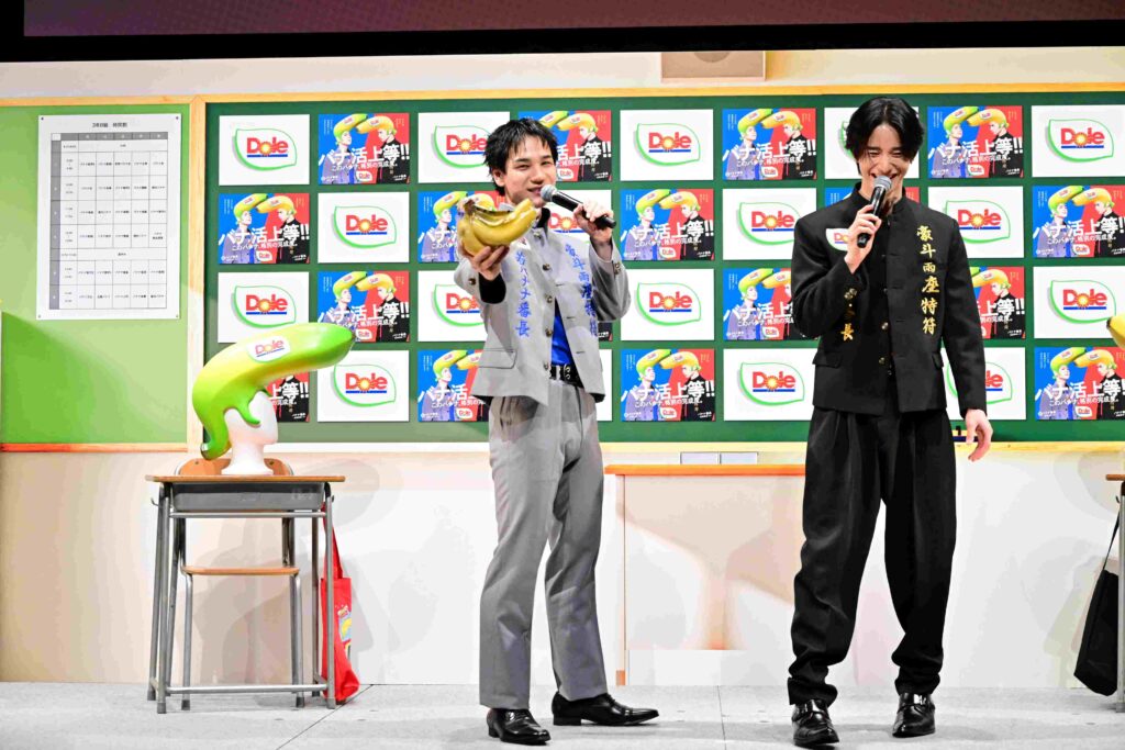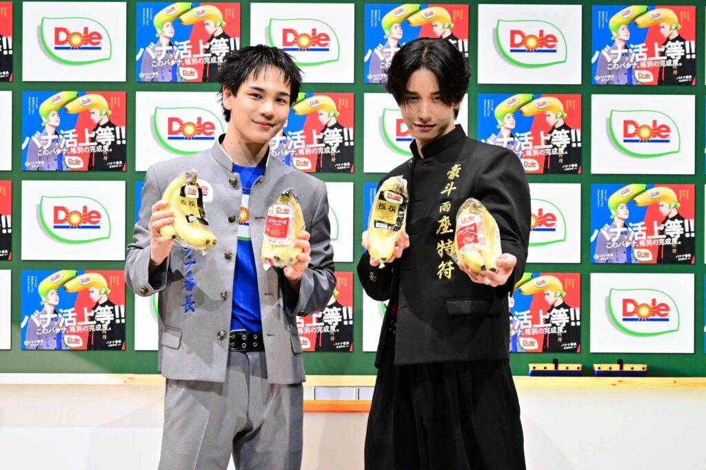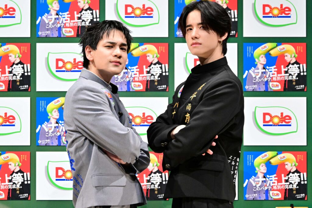 2026.03.27「Doleバナ活サポーター バナナ番長」の佐藤景瑚(JO1)、今回から強力なライバルとして参戦する豆原一成(JO1)が都内で行われたPRイベントに登場した。
