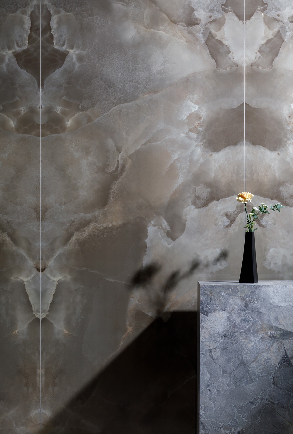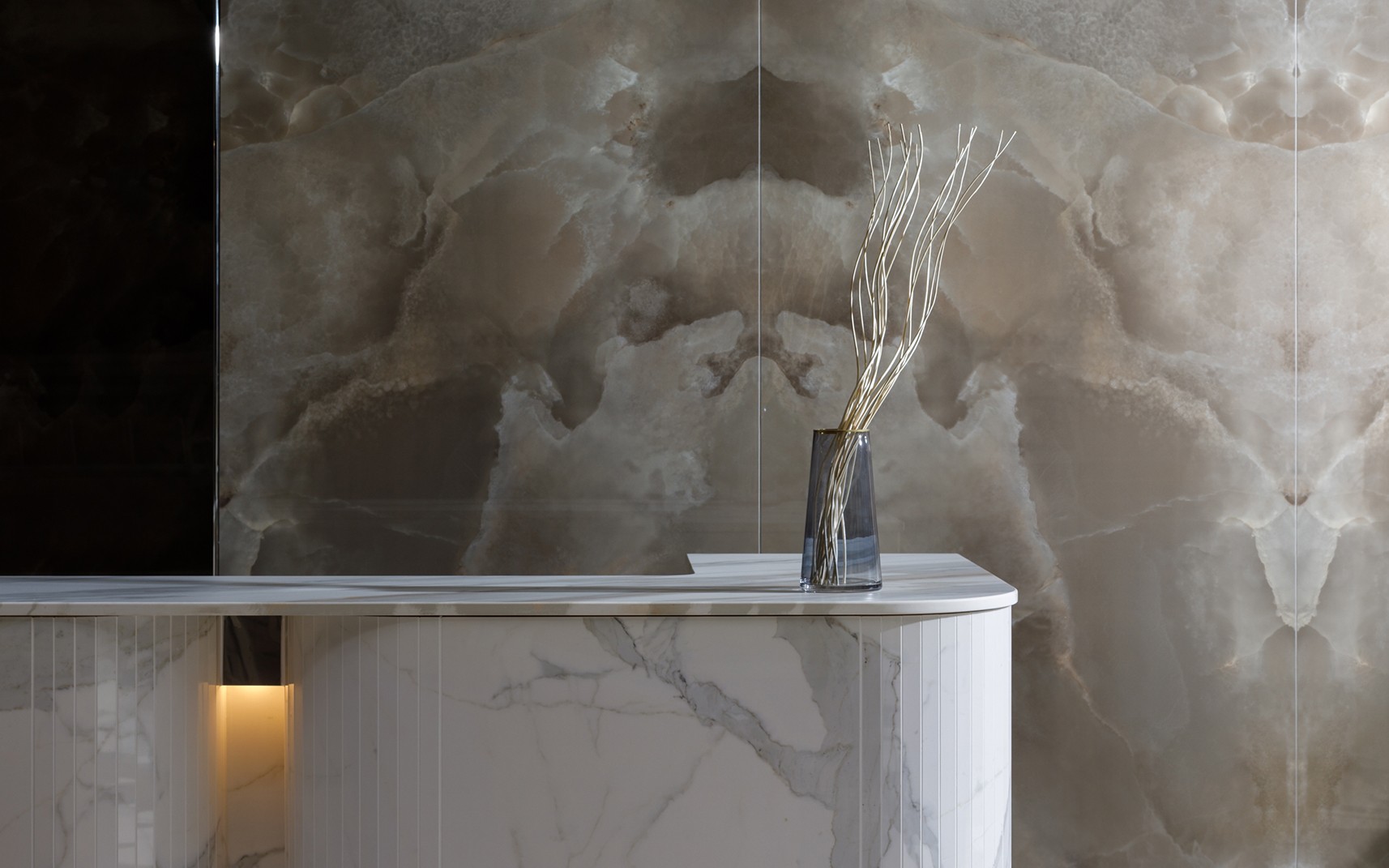 ショールームエントランスのレセプションカウンターとバックウォールが、新しい装いに生まれ変わりました。バックウォールには「オニーチェルーチェ」の迫力あるブックマッチ模様を採用し、レセプションカウンター天板には4Dセラミックを使用しています。最新技術がもたらす、美しい意匠と豊かな質感で皆さまをお迎えします。
