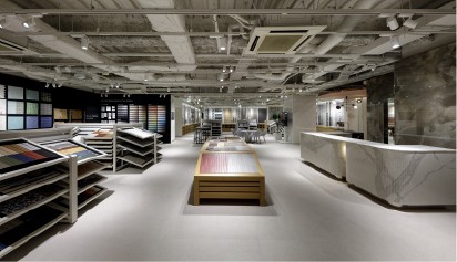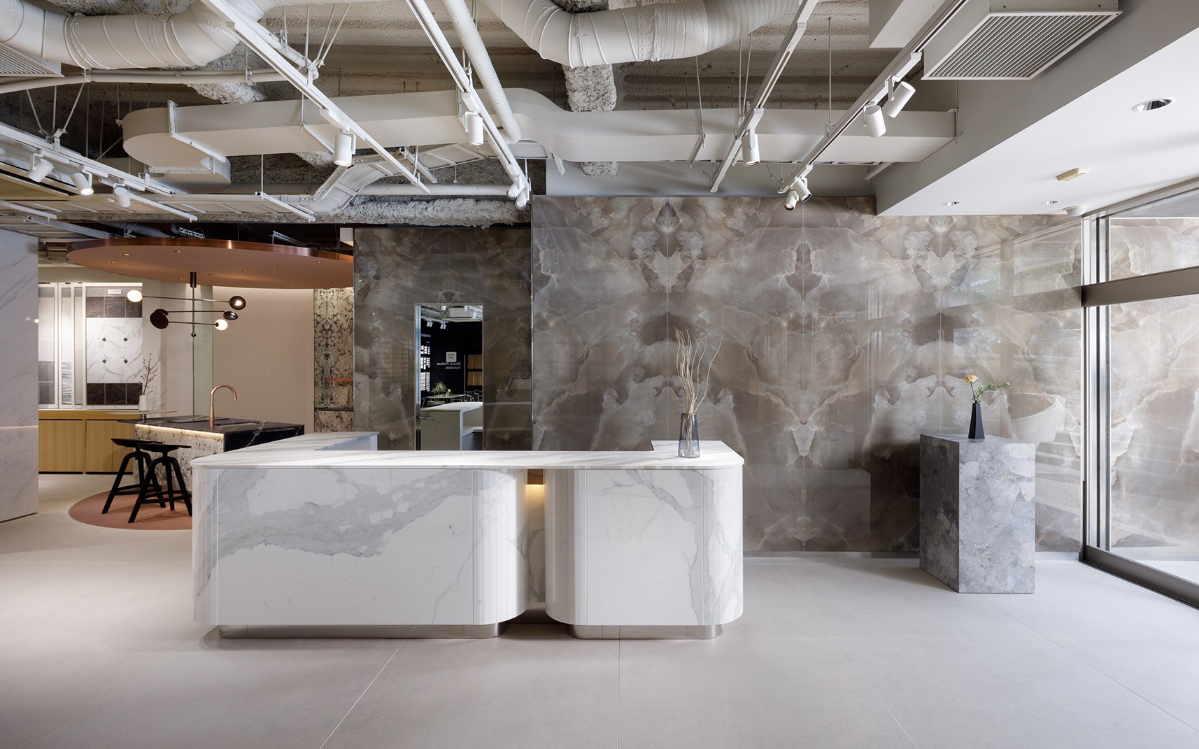 2026年3月、4Dセラミックを贅沢に使用したキッチンのモデルブースに加え、レセプションカウンターや打合せテーブルなどタイルファニチャーを新たに取り入れ、内外装を一新。