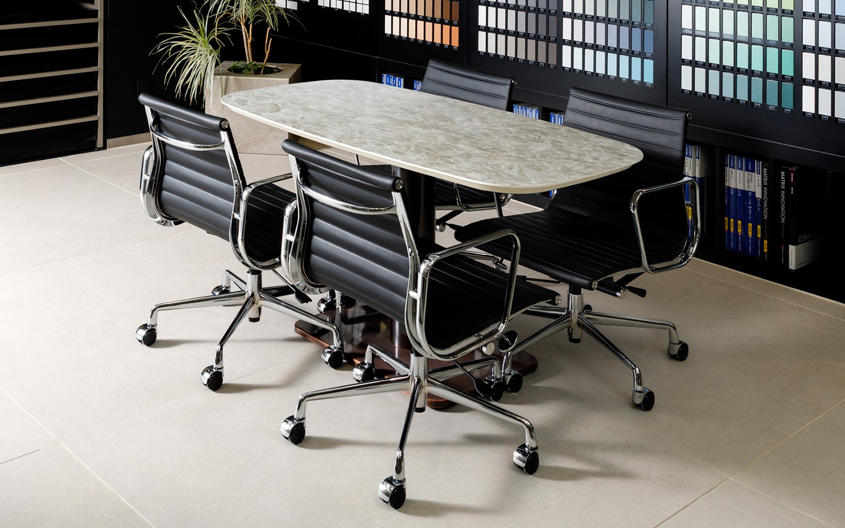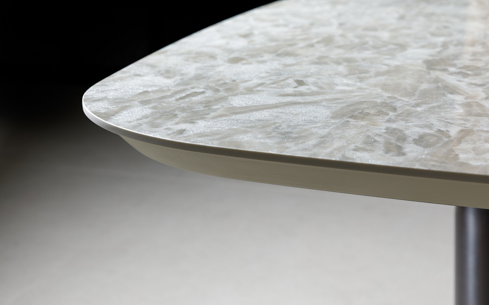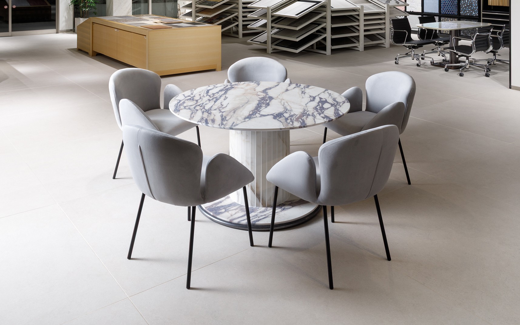 超大判タイルから切り出したテーブルトップは、イタリアのトップブランドメーカーによって製造されたものです。セラミックファニチャーに採用している4D CERAMICSは、独自の製造技術によりタイル内部まで柄が連続するフルボディ構造を実現。切断面や小口にいたるまで、まるで天然石のような深い美しさを表現します。空間に美しくなじみながら、確かな存在感を放つセラミックファニチャーの魅力をぜひご覧ください。