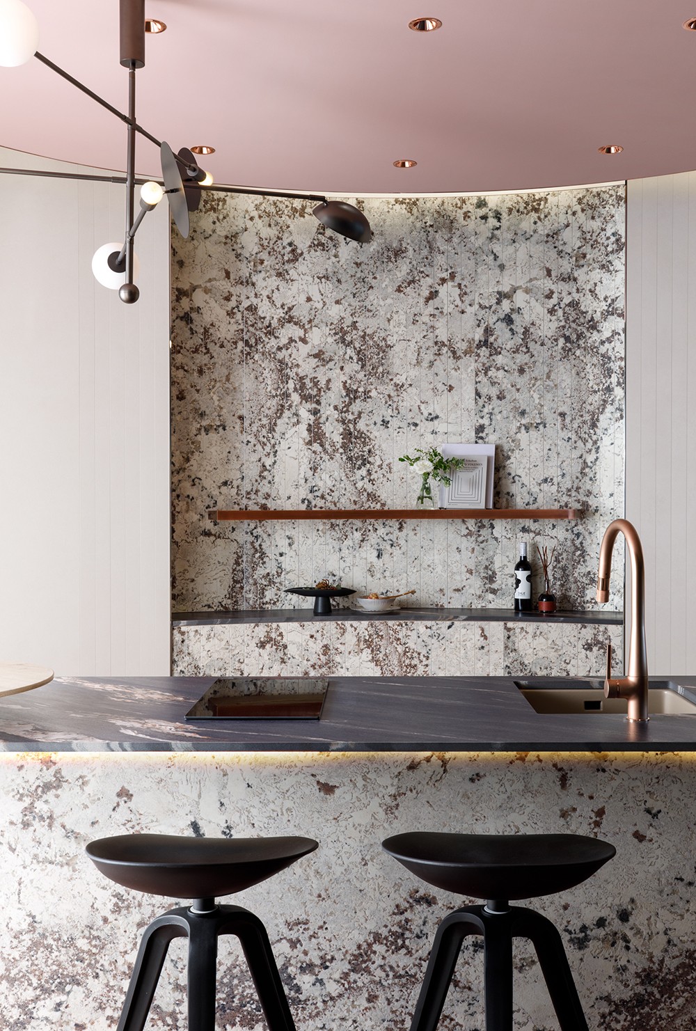 キッチン天板:4D CERAMICS KUROCA 4D CASHMERE(t=20mm)キッチン腰壁:マルミマキシマム ALASKA WHITE TOP-LAPPED(t=6mm)バックウォール:マルミマキシマム ALASKA WHITE TOP-LAPPED(t=6mm)・BALANCE IVOLY(t=6mm)床:BALANCE MARSALA RED(t=8mm)