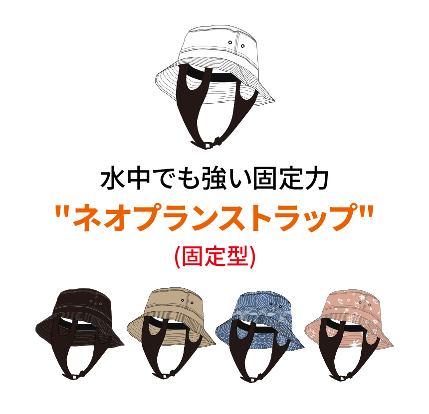 · ネオプレン素材ストラップ: ウェットスーツ同等のフィット感で、強風や激しい動きでも帽子を頭にロック。貼り付け型なので着脱もスムーズです。