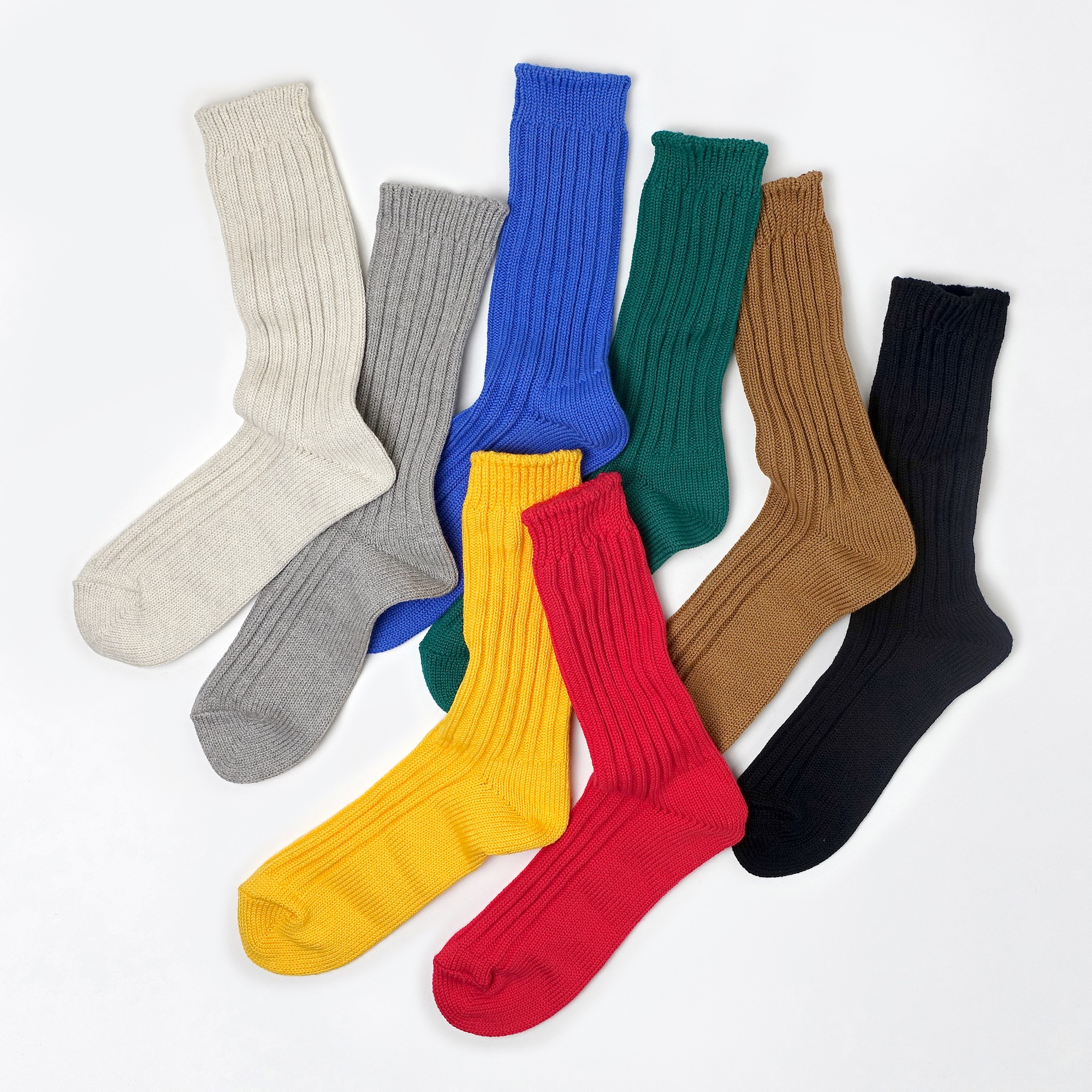 生産には、国内では希少となったローゲージのリブ編み機を使用し、時間をかけてゆっくりと編み立てています。空気を含んだ編み地は、ふっくらとした厚みとほどよい弾力があり、締めつけ感が出にくく、足にやさしくなじみます。