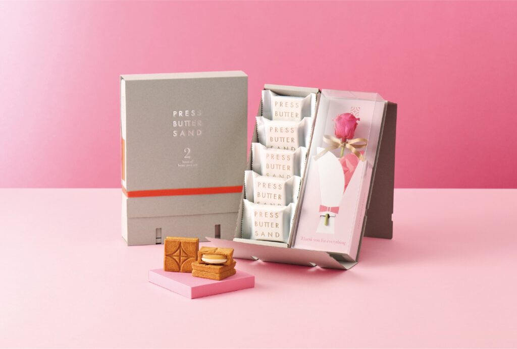 ザクザク食感と濃厚なバター風味が魅力の『PRESS BUTTER SAND』の定番バターサンドと、1輪のローズギフトのセットはさりげないサイズ感が魅力。肩ひじを張らずに、日頃の感謝を伝えることができますね。