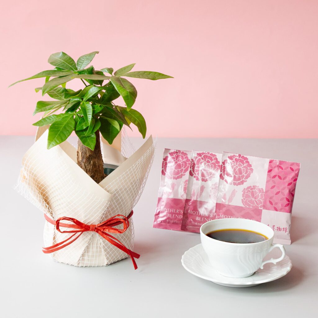 まずは、自家焙煎のスペシャルティコーヒーで人気の『椿屋珈琲』と、フラワー&グリーンの通販を展開する『AND PLANTS』がコラボした、母の日限定ギフト。花束やアレンジ、観葉植物にコーヒーを組み合わせた母の日限定のセットは、全部で6種類。豊かなバリエーションの中から、贈る相手にふさわしいギフトを選ぶことができます。