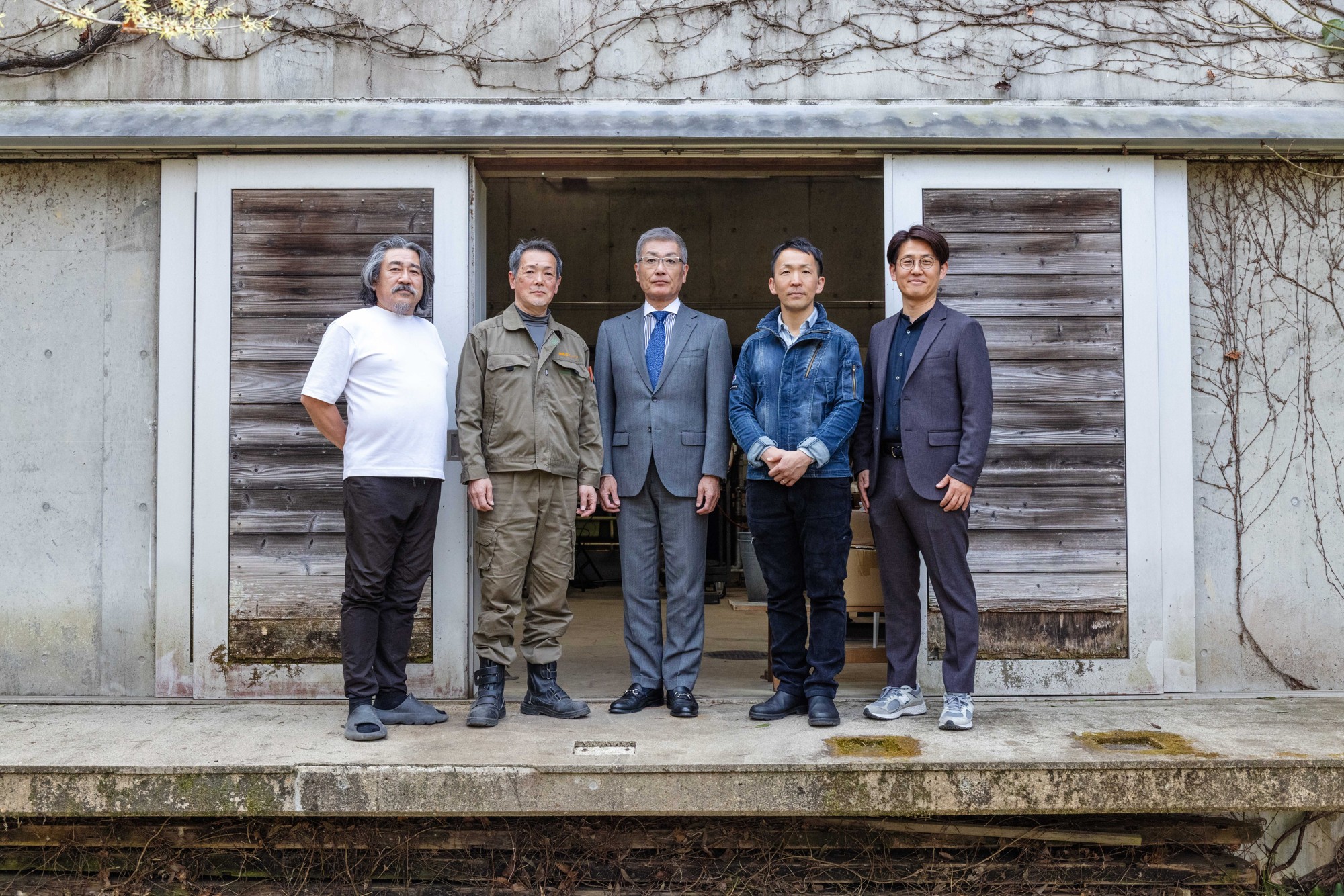 ロジェクトメンバー(右から) ブルーファーム株式会社 代表取締役 早坂正年、株式会社あいホーム 代表取締役 伊藤謙、株式会社宮城衛生環境公社 専務取締役 渡邊博康、株式会社丹野林業建設 丹野浩三、海馬ガラス工房 代表村山耕二