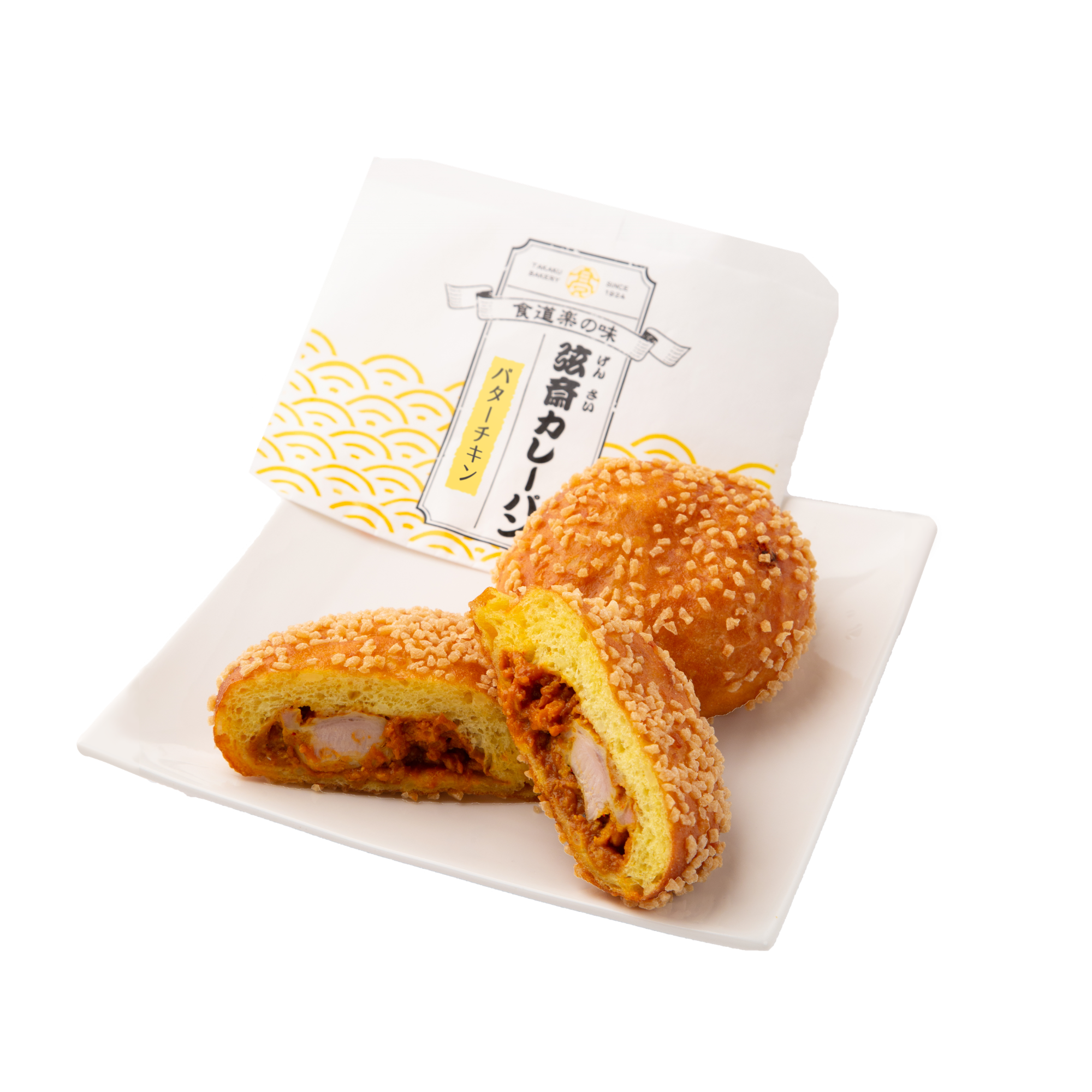 元祖・弦斎カレーパン。ご飯を練り込んだもちもち生地に、ターメリックを加えることでカレーの風味をほんのり感じられる仕上がりです。中には24種類のスパイスを使用した本格カレーと、カレーライスを再現する福神漬けを忍ばせました。カレーライスをそのまま包んだ満足感のある一品です。