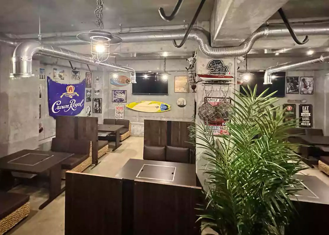 地下にある室内会場は、雨でも夏の日差しが強くても関係なし。小田急片瀬江ノ島駅から目と鼻の先の好立地で、海遊びの前後にも最適です。2名様からのデートや少人数グループでも気軽に本格BBQを楽しめます。