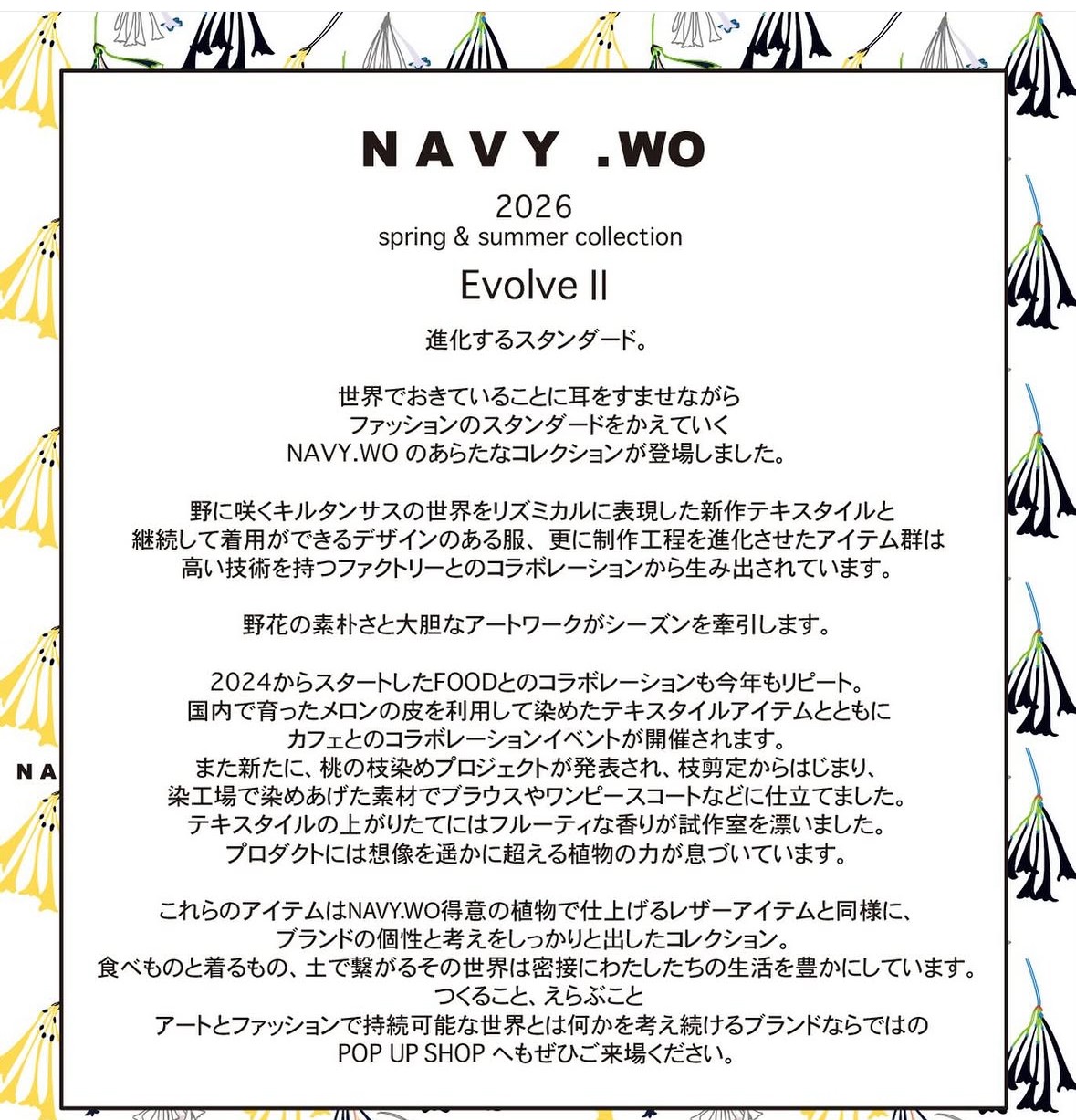ポップアップショップでは、メロン染めを施したトップスやオーガニックコットンTシャツなど、複数のアイテムを販売予定です。特に注目は、新しく描きおろされたCyrtanthus(キルタンサス)プリント柄を採用した製品の入荷です。このプリント柄は、ブランドの美的価値観とサステナビリティへの姿勢を融合させたデザインとなっています。