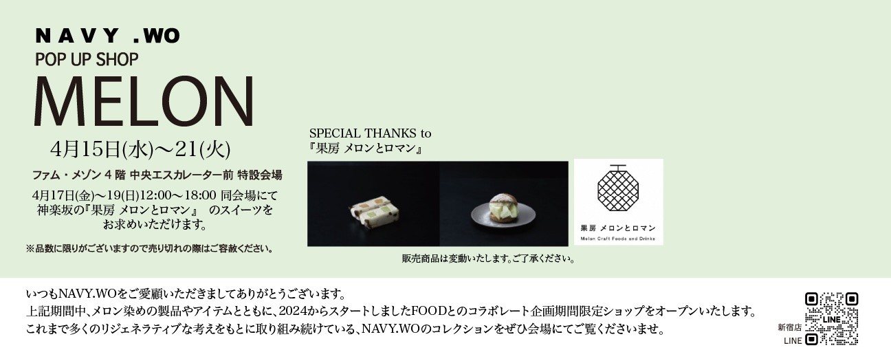 Sotoo design co.ltd(所在地:東京都世田谷区奥沢5-20-17-1F)は、ファッションブランド「NAVY.WO」において、メロン染めを施した製品を展開するポップアップショップを、2026年4月15日(水)から21日(火)まで新宿高島屋ファム・メゾン4階の中央エスカレーター前特設会場にてオープンいたします。