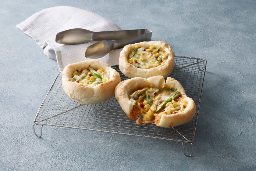 パンの器に、チーズ、ボロネーゼソース、南富良野直送アスパラガス、コーンを入れて焼き上げた東武限定パン。