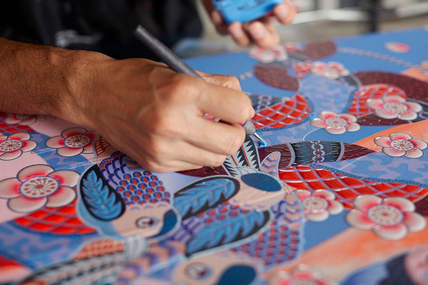 絵本作家レオ・レオニの『スイミー』と、日本の伝統革工芸「甲州印伝」が初コラボレーション!小さな魚たちとスイミーを2色の漆で表現した、「財布」「ポーチ」「ミラー」など、7種類を渋谷ヒカリエ内で開催中の「レオ・レオーニの絵本づくり展」で先行発売!