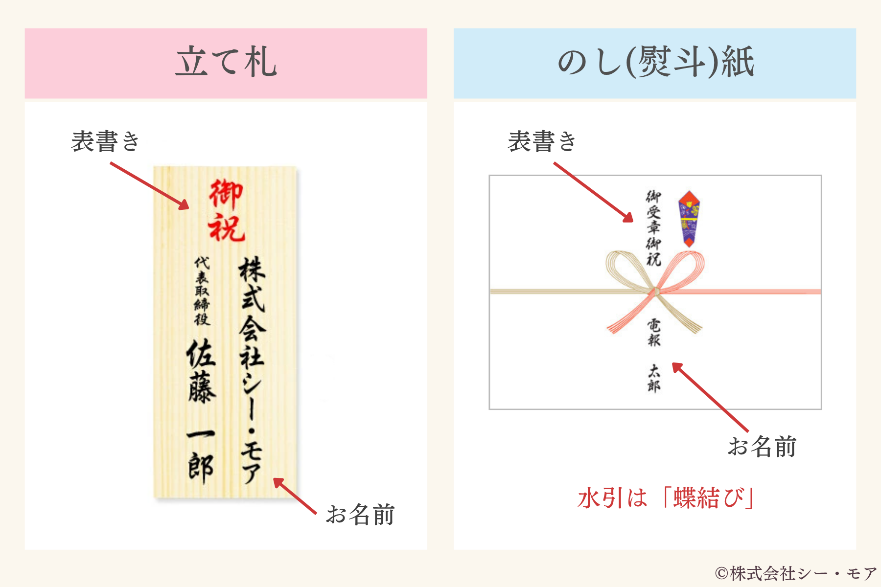 お祝いの贈り物には、内容に応じて「立て札」や「のし(熨斗)紙」を付けるのが一般的です。