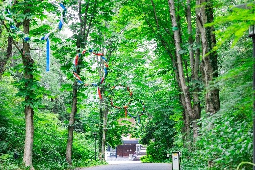 メッツァ入口のエントランスロード「メッツァティエ」では、夏至祭のマストアイテム「花冠」をモチーフにおめかしした「北欧8ヶ国の 夏至の花冠ロード」が登場。北欧各国の国旗カラーのリボンを上品に あしらった巨大花冠はインパクト抜群!