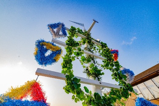 メッツァ入口のエントランスロード「メッツァティエ」では、夏至祭のマストアイテム「花冠」をモチーフにおめかしした「北欧8ヶ国の 夏至の花冠ロード」が登場。北欧各国の国旗カラーのリボンを上品に あしらった巨大花冠はインパクト抜群!