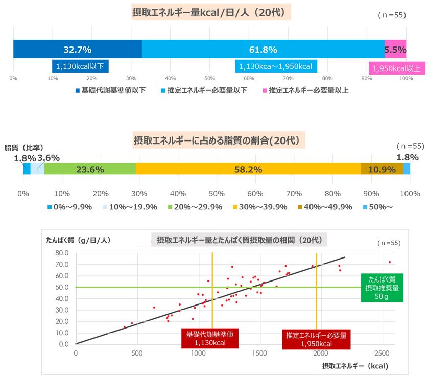 2025年6月に、一般の成人女性が豆乳を日常の食生活に取り入れていることによって、食生活にどのような影響をもたらしているのかを明らかにすることを目的に、20代と40代女性を対象に3日間の食事記録調査を行いました。その中で、20代の女性55名のたんぱく質、脂質、炭水化物、エネルギーの数値を分析したところ、「摂取エネルギーの不足」と「脂質摂取比率の過多」という2つの課題が浮かび上がりました。20代女性の約3人に1人(32.7%)が、基礎代謝基準値(1,130kcal/1日)以下のエネルギー量しか摂れておらず、普通の身体活動を行っている女性の推定エネルギー必要量を満たしている人は5.5%しかいない結果となりました。また、脂質の摂り過ぎも20代女性の課題としてあげられます。