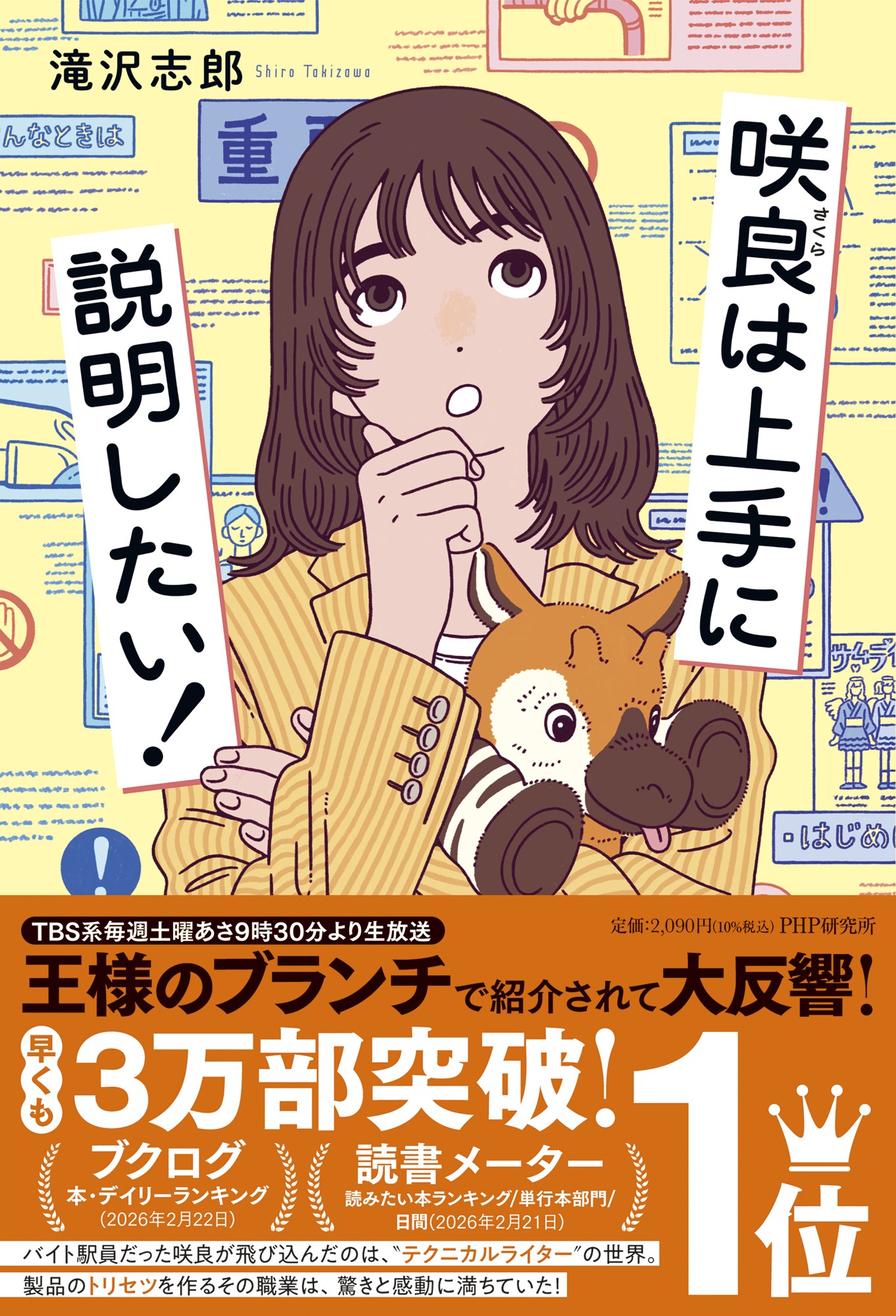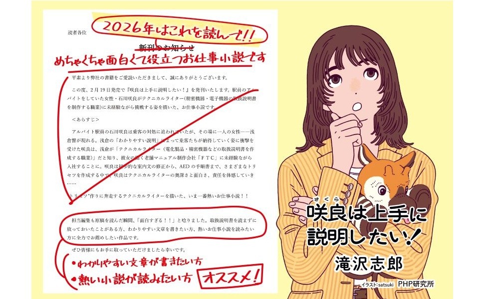 2026.04.21株式会社PHP研究所(京都市南区・代表取締役社長 瀬津 要)は、滝沢志郎著『咲良は上手に説明したい!』(2026年2月19日発売/税込2,090円)が、発売から約2か月で(4月28日時点/5刷)累計発行部数3万部を突破したことをお知らせいたします。滝沢志郎氏は、松本清張賞受賞作『明治乙女物語』など、これまで歴史・時代小説を多く執筆してきましたが、実は取扱説明書などを作成するテクニカルライター出身。自身初の現代小説となった本作では、経験を存分に生かして、マニュアル作りの世界に飛び込んだ主人公の奮闘を熱く描いています。読者からは、「小説なのに、読むと文章が上手くなる」「勉強になった」など、異例の感想が多数寄せられ、楽しみながらスキルアップができると好評を得ています。