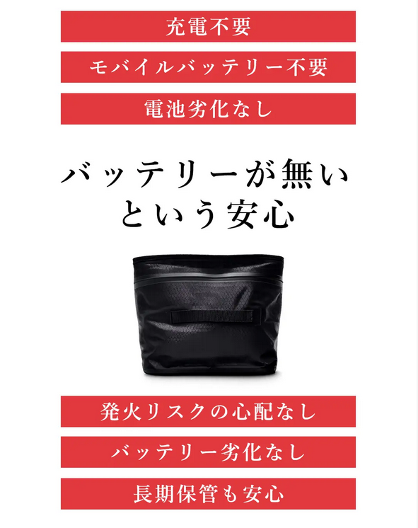 内蔵ポンプにバッテリーが搭載された従来品は、発火リスクなどの安全性への不安から、飛行機の預け荷物として利用できない問題も利用者から指摘されていました。「Slim Vac」は製品内にバッテリー非内蔵の為、預け入れ荷物としてトランクに入れることも可能。高温になる車内などでも安心してお使い頂けます。