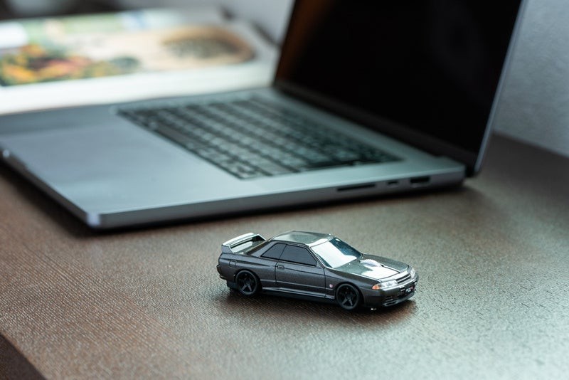 本体は、GT-R (BNR32)のシルエットを忠実に再現した車型マウスです。ガンメタリックのボディカラーと細部まで作り込まれた造形により、まるでミニカーのような存在感を放ちます。サイドのラインやリアウィングのフォルムなど、GT-R (BNR32)ならではのデザインをしっかりと表現。フロントライトとリアライトは電源ON時に点灯し、デスクに置くだけでインテリアとしても絵になる仕上がりです。